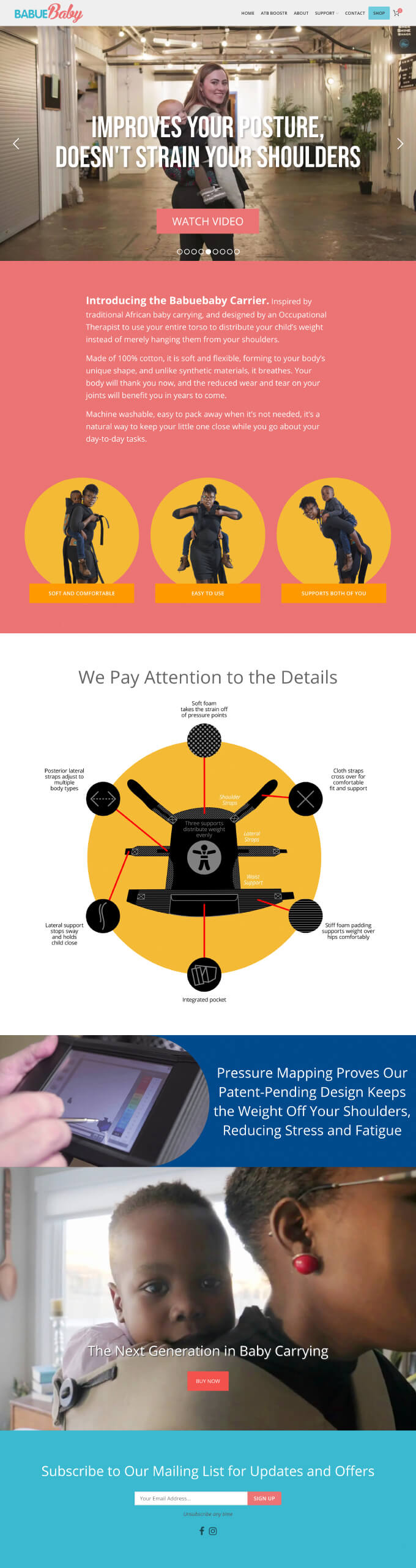 Awarded a patent and set to revolutionize baby carrying, Babuebaby was ready to get the word out. We absorbed all the info she had and set about creating a website that showed off the comfort and freedom wearing the carrier provided while satisfying potential customers’ needs to understand how it was made and why it was better. With photo shoot assets available we combined that with infographics we created and a bright, fun colour palette.