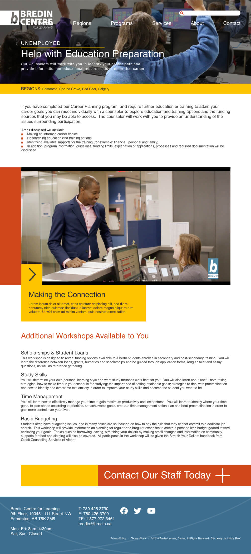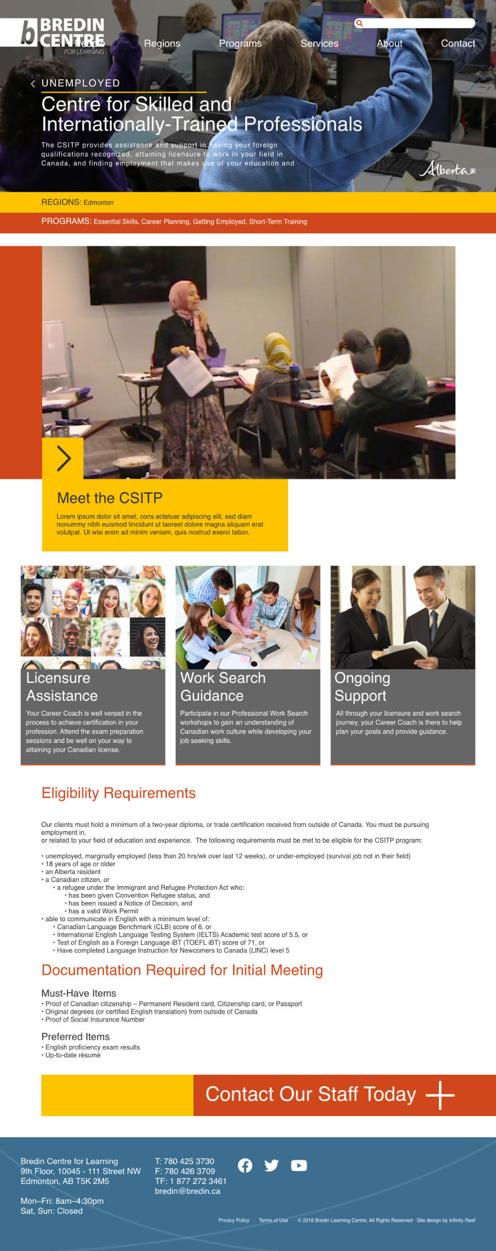 A non-profit organization providing training services to the unemployed, as well as helping immigrants integrate into Albertan society, Bredin serves hundreds of clients on a daily basis. And as an organization with a broad mandate and as many programs, communicating that effectively in an organized way that’s easy to access was our challenge when we were brought on board to update their web presence.