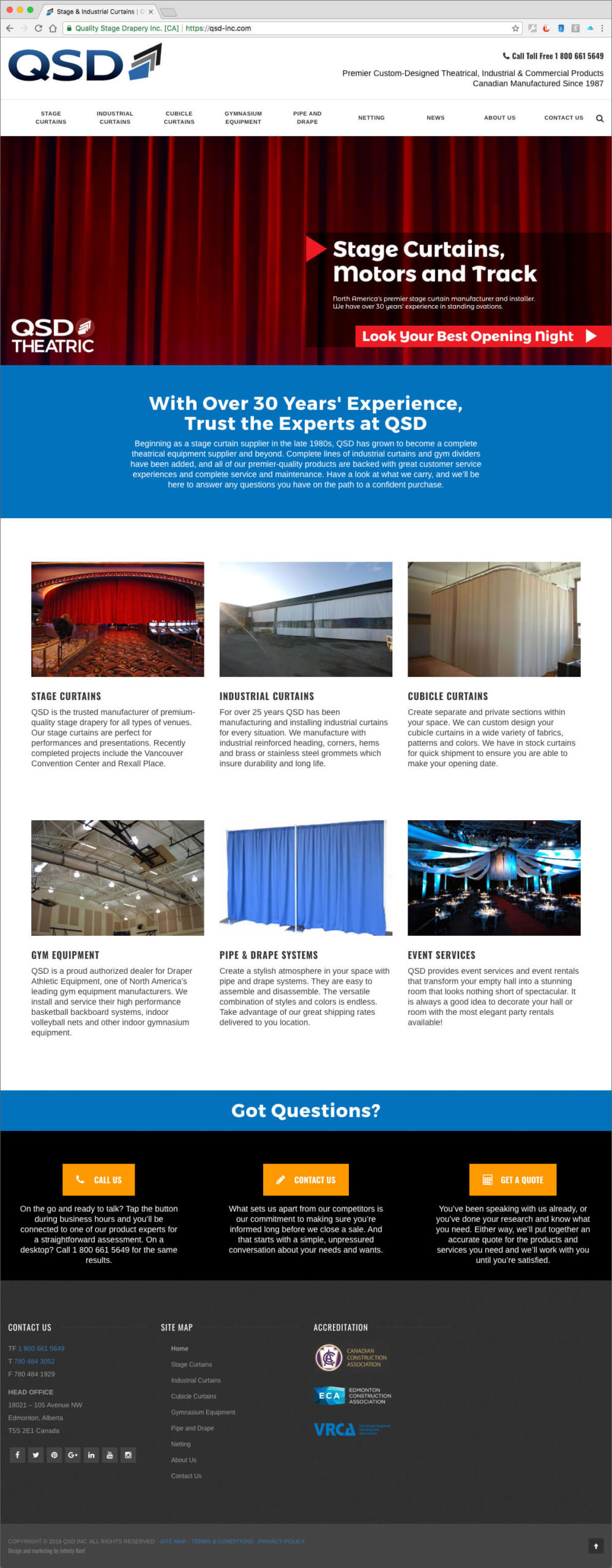 We worked on the larger issue of separate product verticals and different customer bases as we provided QSD with their first major digital marketing campaign. Theatric, Industry and Athletic were given their own sub-logo and colour scheme and identified clearly-defined areas on the site. We wanted to avoid putting theatre curtains in front of a tradesman looking for a new welding booth.